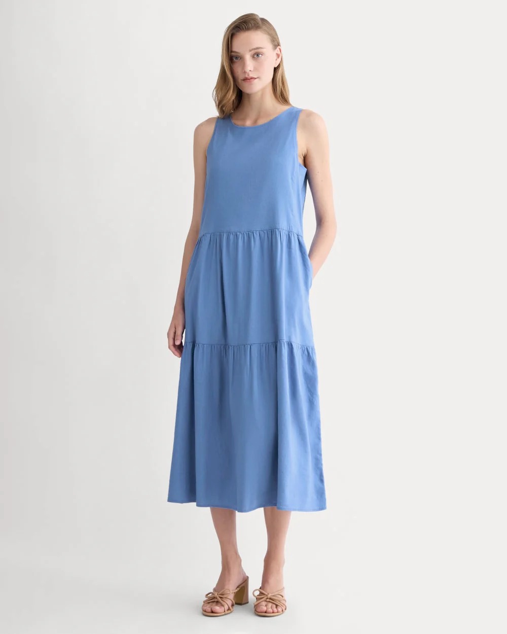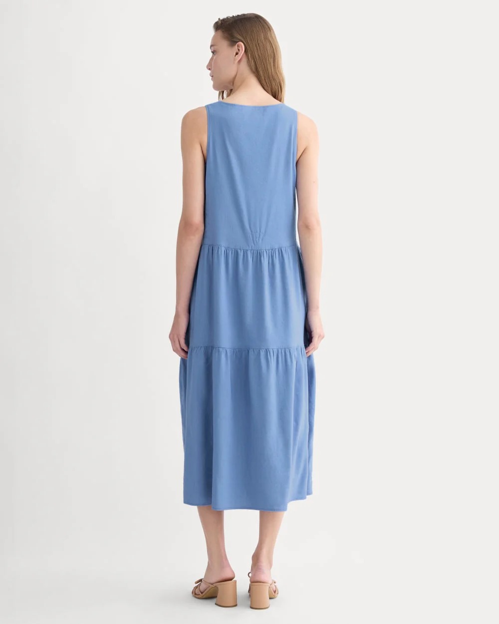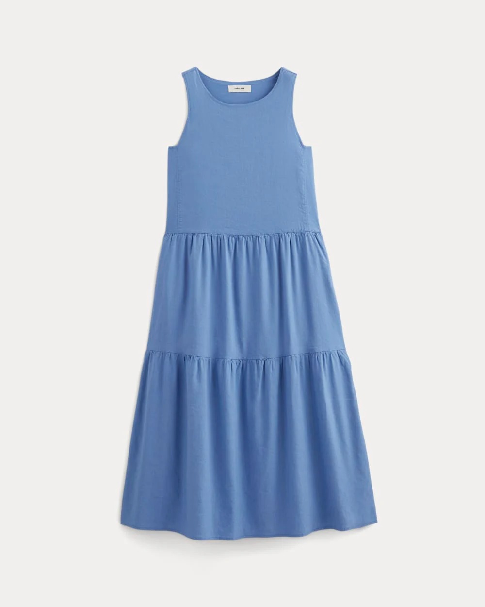 Maxikleid mit Stufenschnitt, Crew-Ausschnitt und seitlichen Taschen aus weichem Stretch-Leinen, geeignet für Alltag und Freizeit.