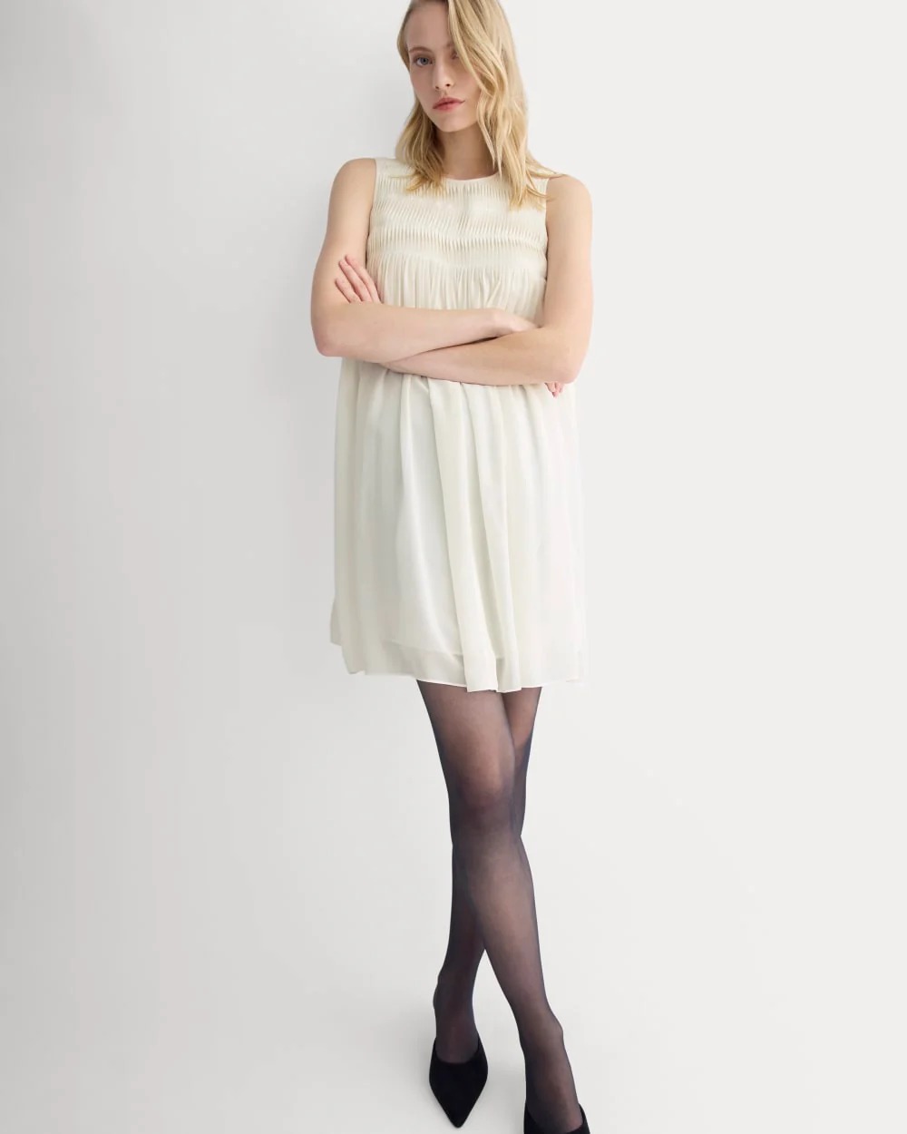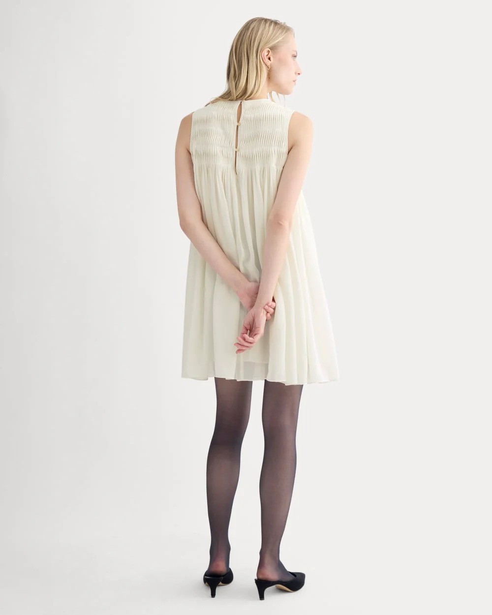 Dieses Mini-Kleid ist ein kurzes Kleid aus leichtem Seiden-Georgette mit gedrehten Falten und schwingender Passform, die Bewegungsfreiheit und Komfort bietet. Der Rücken verfügt über einen Knopfverschluss mit Schlüssellochausschnitt, der zusätzliche Struktur und Details hinzufügt.